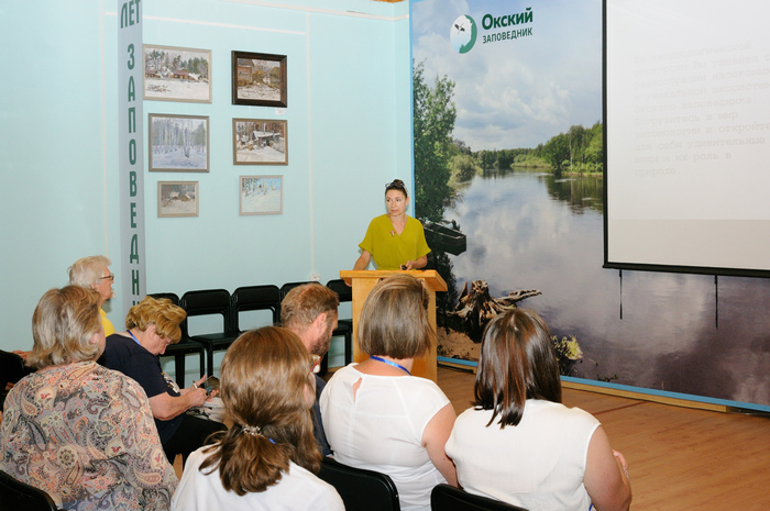Окский заповедник в этом году отмечает 90-летие. Помимо докладов и экскурсий участникам конференции предоставили возможность познакомиться с небольшой видеозарисовкой об истории и кратких итогах его деятельности, а также с выставкой научных трудов, выпущенных заповедником.
