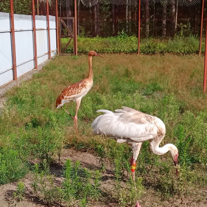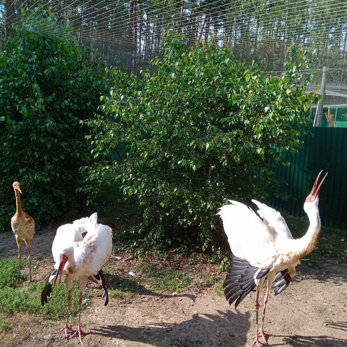 В семьях журавлей подрастают восемь птенцов стерха и два серых. Птенцы разновозрастные. Некоторые уже оперились, другие еще носят пуховой наряд. Семьи журавлей получают корм от персонала, выкармливают птенцов, усердно заботятся о них (обогревают, охраняют) и показывают им, как нужно добывать пищу.