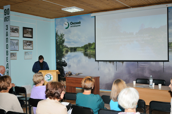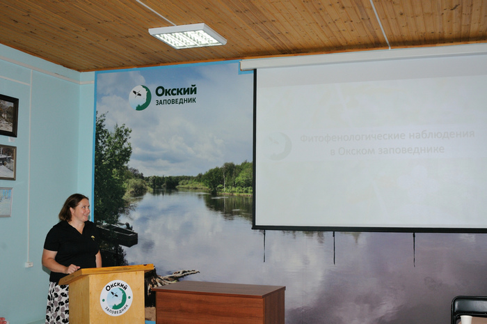 Вторая половина торжественного мероприятия была посвящена научной конференции, на которой выступили с докладами сотрудники научного отдела Окского заповедника. Подобные выступления позволяют сотрудникам, работающим на одной территории, сравнить причины колебаний численности объектов своих исследований, узнать о новых актуальных методах исследований и обработки материалов, поделиться впечатлениями и идеями,обсудить возникающие задачи и проблемы, результаты работы своих коллег. Солидный возраст заповедника дает возможность проследить тенденции в изменении природы, происходящие без прямого вмешательства человека на данной конкретной территории.
