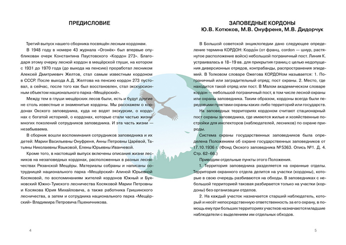 В сборник вошла сводка о кордонах заповедника и очерки о жизни на лесных кордонах Рязанской Мещеры. Авторы — сотрудники заповедника и коллеги с других заповедных территорий.