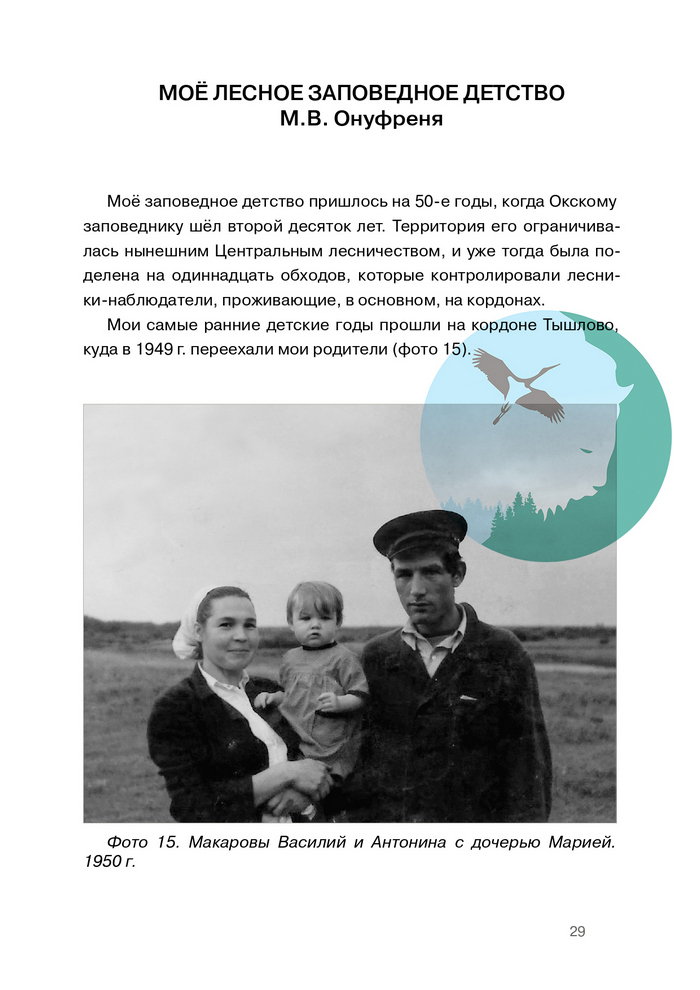 Мария Васильевна Онуфреня (Макарова) родилась в д. Кочемары Касимовского района Рязанской области в семье лесника Окского заповедника.