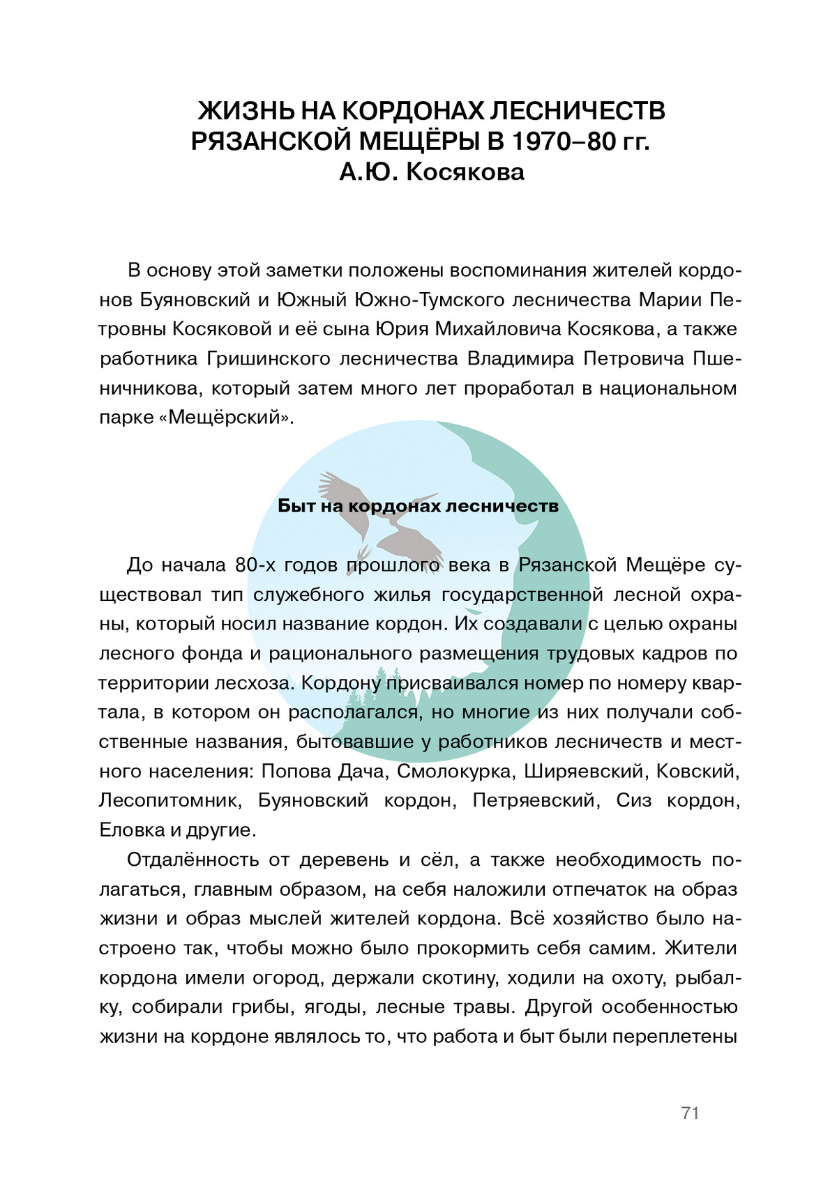 В основу заметок положены воспоминания жителей кордонов Буяновский и Южный Южно-Тумского лесничества Марии Петровны Косяковой и ее сына Юрия Михайловича Косякова, а также работника Гришинского лесничества Владимира Петровича Пшеничникова, который затем много лет проработал в национальном парке «Мещёрский».