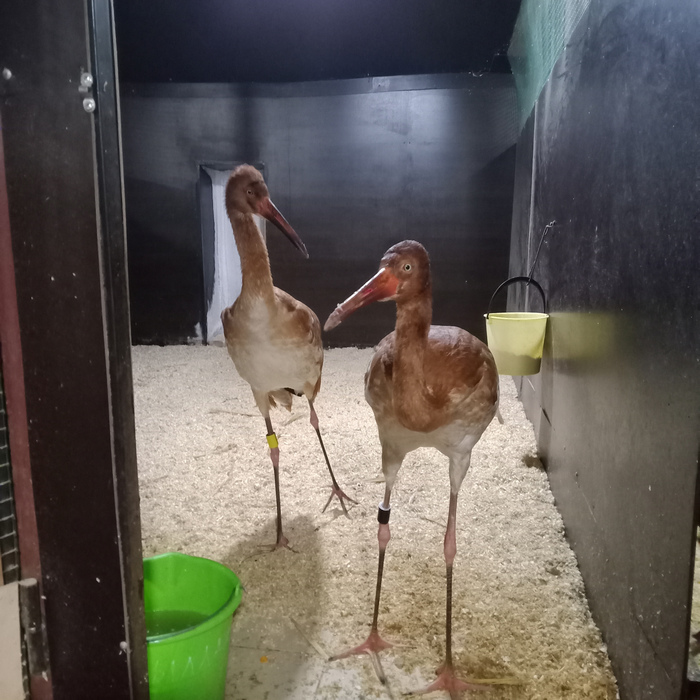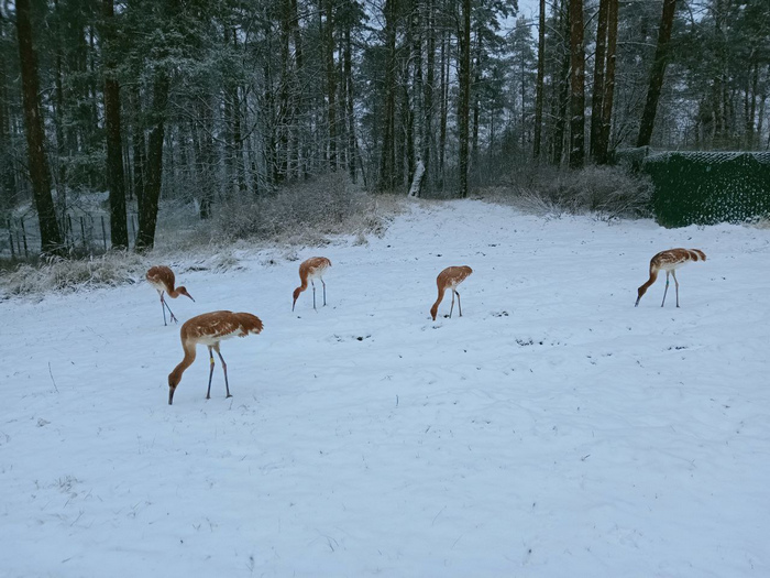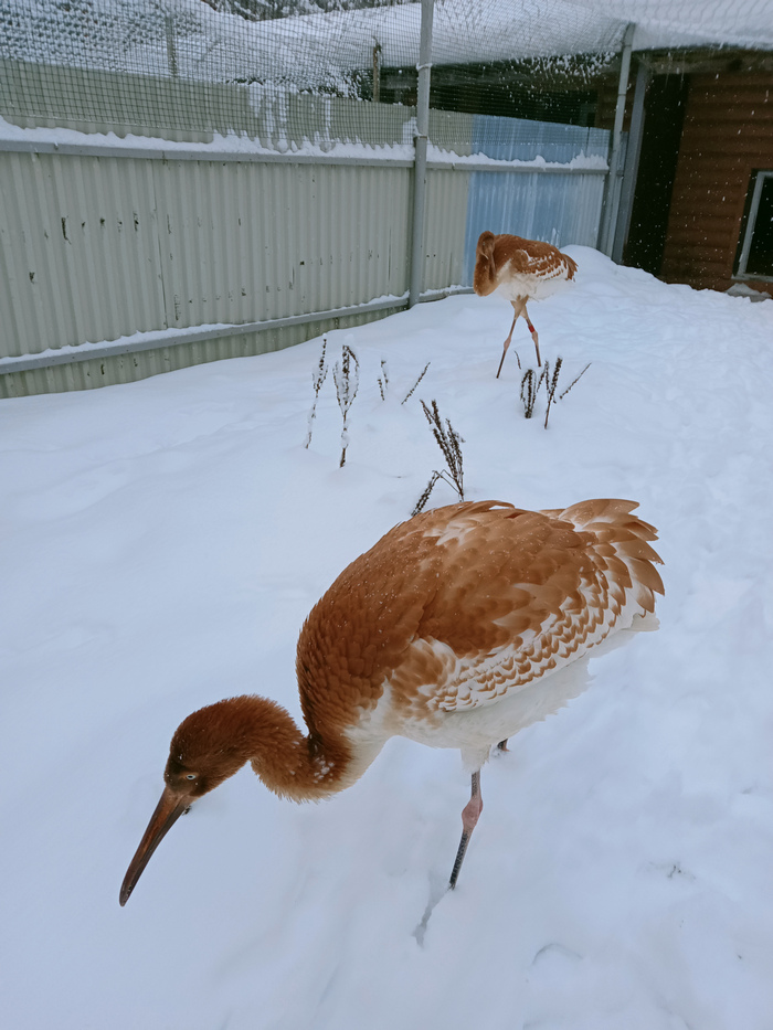 Пять ручных стерхов, полученных из собранных в Якутии яиц, проводят сейчас свою первую зиму в Питомнике редких видов журавлей. По поведению и окраске это пока все еще птенцы и охотно общаются с персоналом, так как выращены ручным методом.